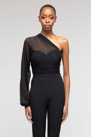 Making a statement is important and Rachel does just that. The figure hugging bodysuit speaks for itself. It features a lightly padded bust and underwire to provide full support. It is overlaid with soft mesh material across the body with a raw, unfinished edge.